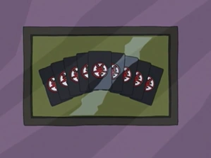 The Hanafuda Cards are a magical deck of cards used to reveal the location of the Oni Masks and to identify their respective removal spell ingredients. They were originally forged in ancient times by Good Chi Wizards to defeat Tarakudo and his nine Oni Generals. The cards operate in groups of three and activate when correctly grouped together. The first card reveals the identity of the Oni Mask, the second its location and the third its removal ingredient. The Hanafuda Cards can only be used once per mask.