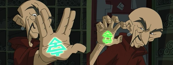 - The magical symbol the Monk paints on his palm changes its appearance from the first time it's shown in clear view (the trapezoid becomes smaller and a horizontal line is added above it).